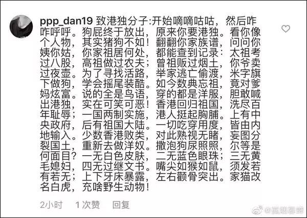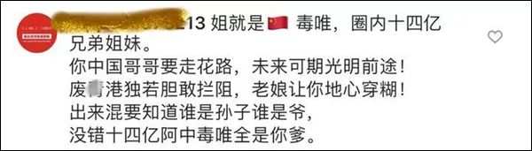 他们自发集结成了数量庞大的“网络远征军”,用特有的饭圈文化,在海外社交媒体上向发表“港独”言论的人开战,“抱走我家阿中(中国)哥哥,请‘港独’独立行走,不要来碰瓷。”