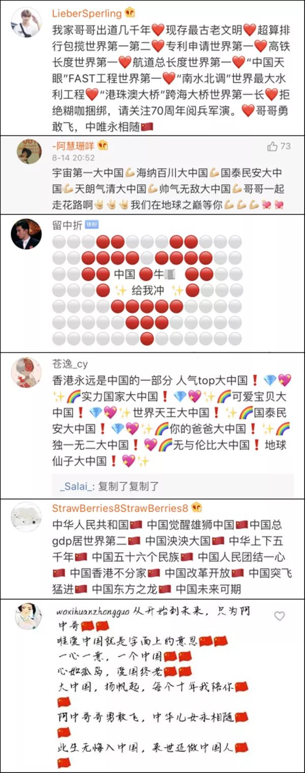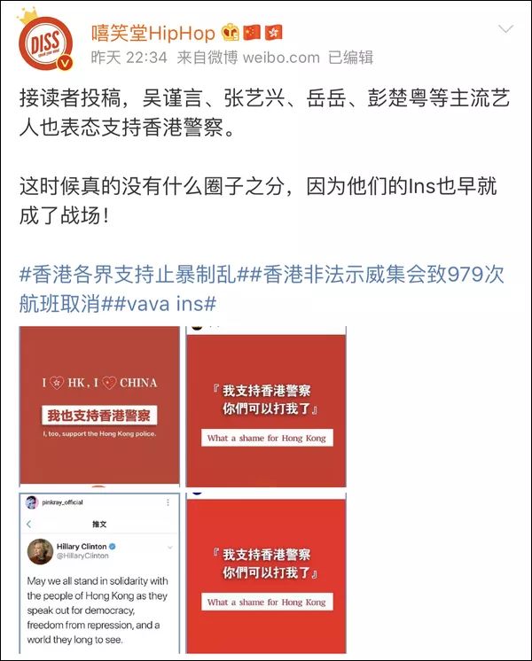 香港乱局之际,越来越多的中国艺人发声支持香港警察,高喊“香港是中国的一部分”,争做国旗“护旗手”。有不少人还在海外社交平台转发了相关内容。