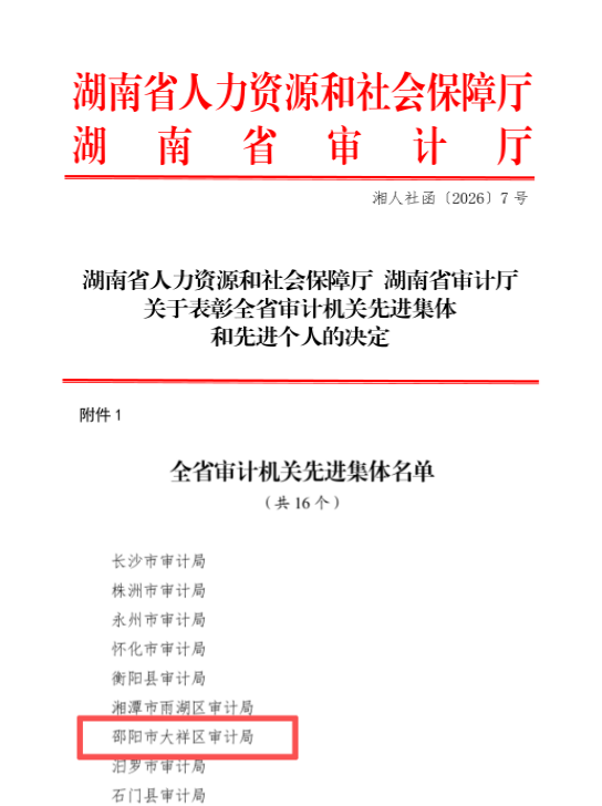 大祥融媒讯:2026年1月22日,湖南省人力资源和社会保障厅、湖南省审计厅联合发文,授予邵阳市大祥区审计局"全省审计机关先进集体"荣誉称号。该局成为本次表彰中邵阳市唯一获此殊荣的县级审计机关,标志着大祥区审计工作获得省级高度认可。