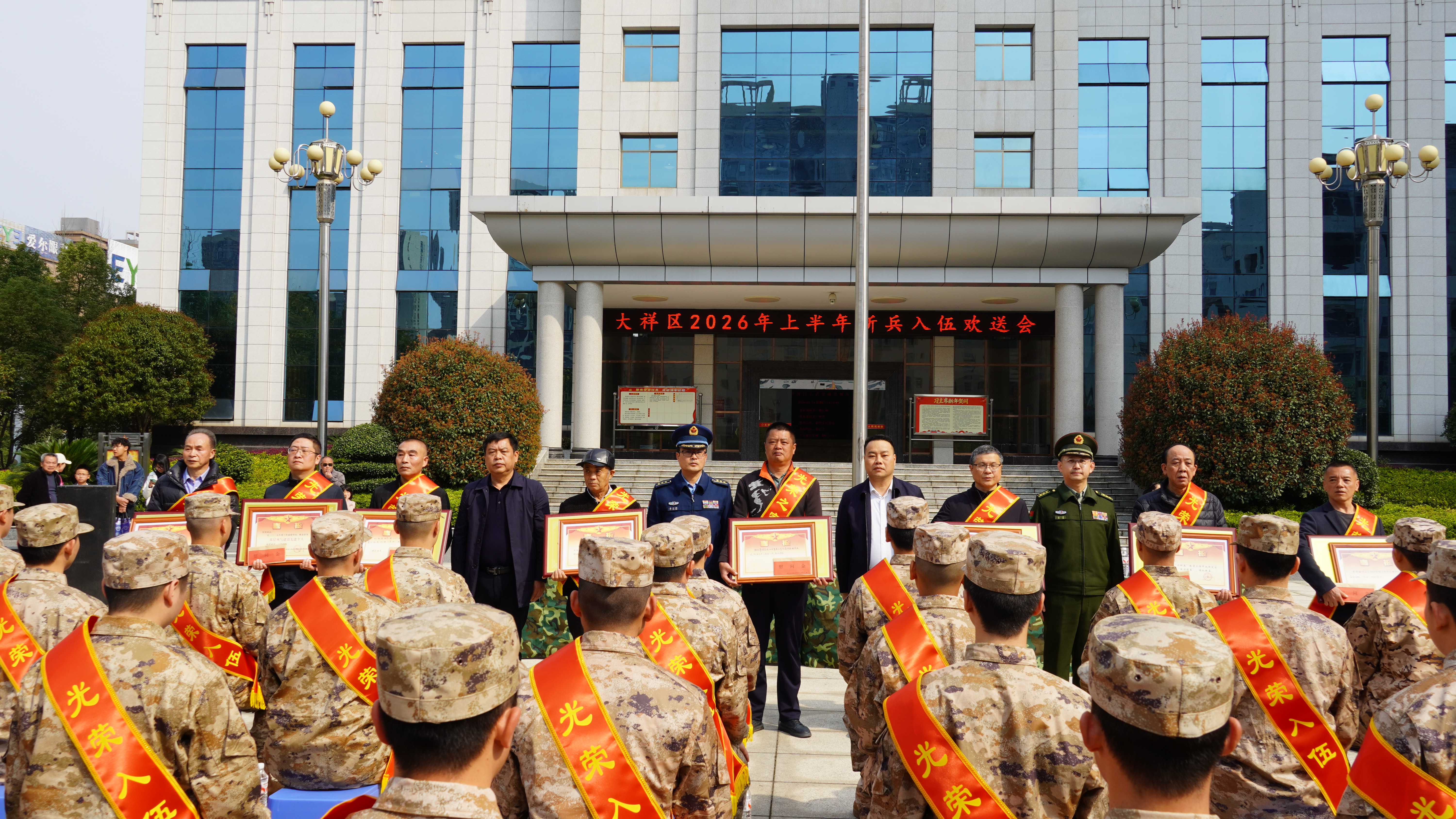 大祥融媒讯:3月14日上午,邵阳市大祥区2026年上半年新兵欢送大会在大祥区人武部隆重举行。全体新兵身着迷彩戎装、胸佩鲜艳红花、身披“光荣入伍”绶带,军容严整、英姿勃发,带着家乡人民的殷切期望和报效祖国的满腔热忱,即将奔赴火热军营,开启保家卫国的光荣征程。大祥区区委常委隆伟峰、区人武部主要领导、全体新兵及家长、基层专武干部、2025年三等功臣家属代表参加大会。