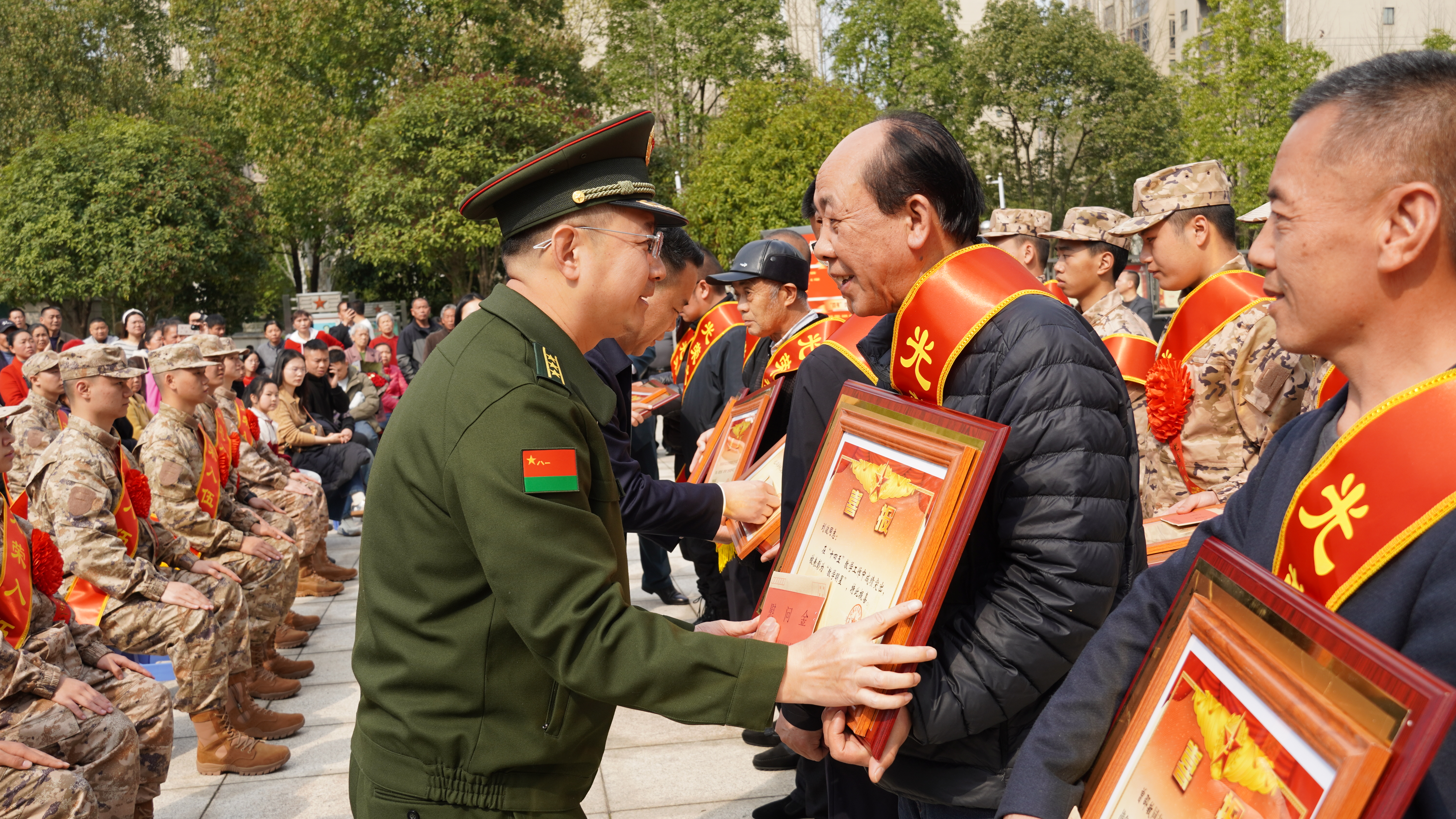 在热烈的掌声中,大会举行辖区立功人员集体送喜报仪式。区级领导现场为荣立三等功及荣获表彰的8名现役军人家庭代表佩戴“光荣之家”绶带、颁发喜报和奖励金。一份份喜报承载着军人的血汗与荣光,为新兵们上了一堂生动的入营前教育课,极大激发了他们建功军营的昂扬斗志。