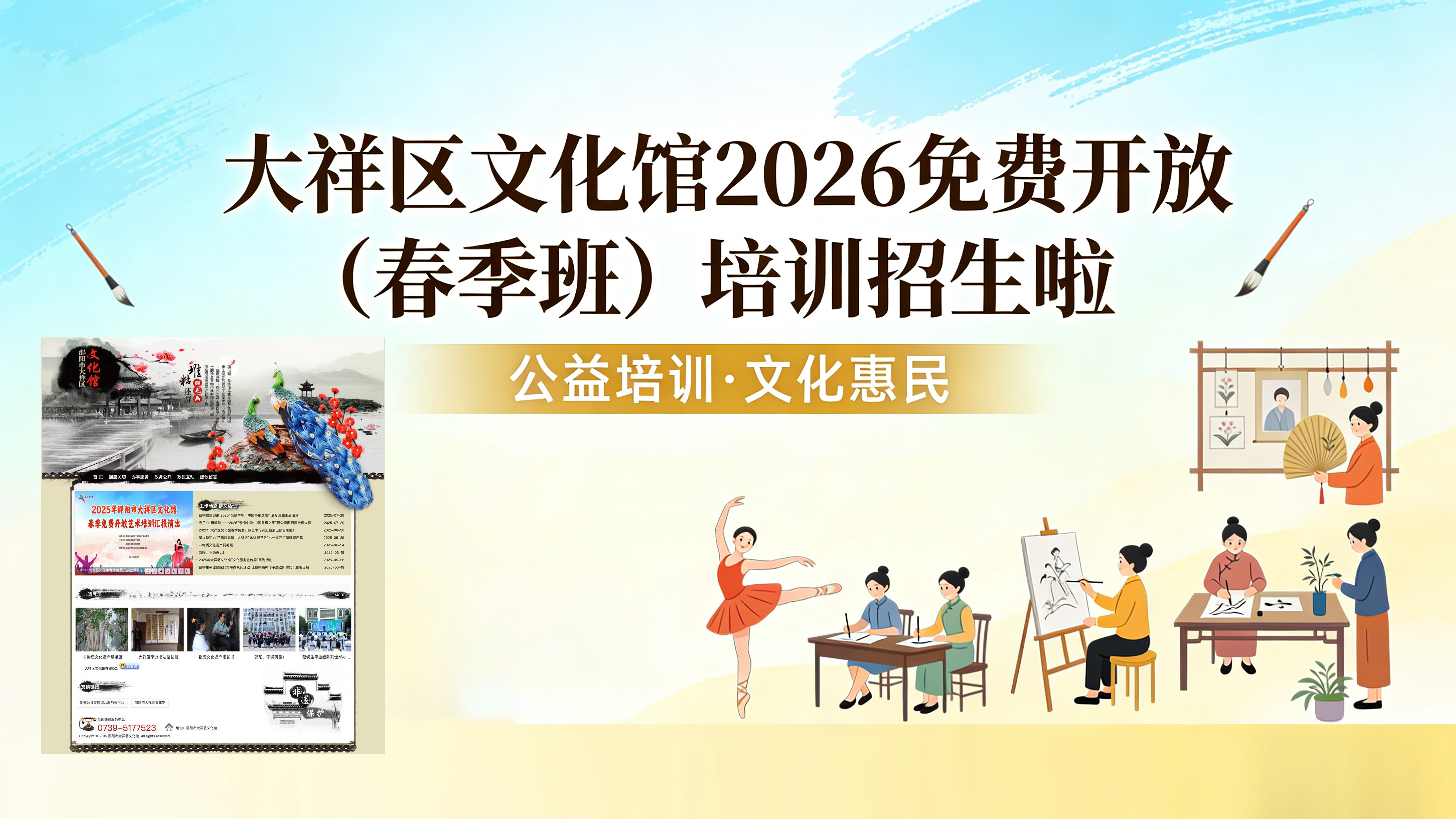 大祥融媒讯:近日,大祥区文化馆2026年春季免费开放培训班正式拉开帷幕。本次课程延续公益惠民初心,精心策划多元艺术课堂,旨在为不同年龄层的市民朋友提供高品质、零门槛的艺术学习平台,让文化发展成果更公平地惠及大众。