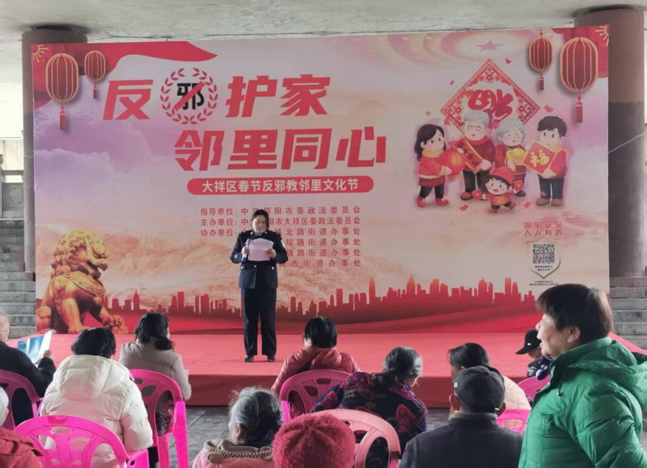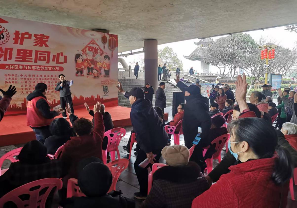 大祥融媒讯:为深化反邪教宣传教育,厚植平安建设根基,在新春氛围中传递科学文明理念,3月3日,大祥区委政法委在资江南路举办“反邪护家 邻里同心”春节反邪教邻里文化节活动。活动以群众喜闻乐见的形式,将法治宣传、志愿宣讲、互动问答与文艺展演融为一体,吸引广大居民踊跃参与,营造崇尚科学、反对邪教、邻里守望、共建平安的浓厚氛围。